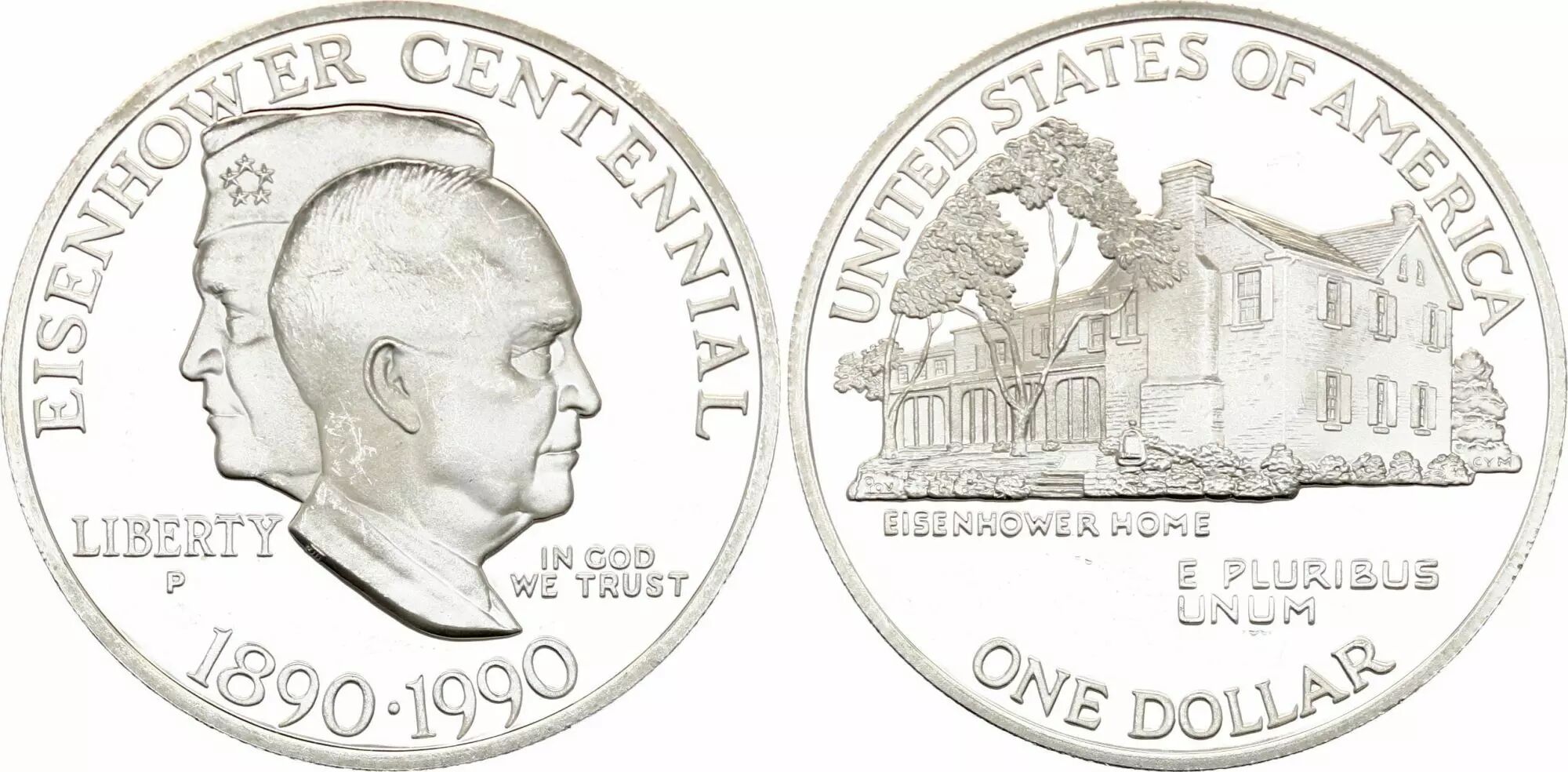 Cette pièce commémorative est un dollar américain frappé en 1990 par l'atelier de Philadelphie. Elle a été émise pour célébrer le centenaire de la naissance de Dwight D. Eisenhower.