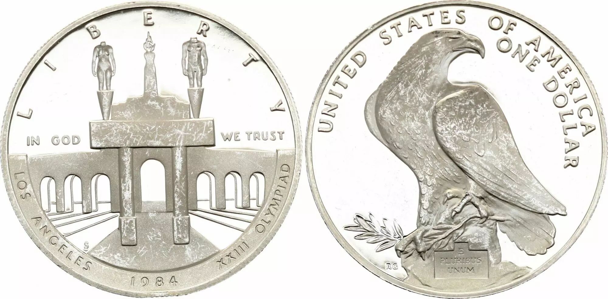 This is a commemorative coin with a face value of one dollar, issued by the United States in 1984. The coin is struck in silver and commemorates the Olympic Games. The mint is San Francisco, identified by the mint mark "S".