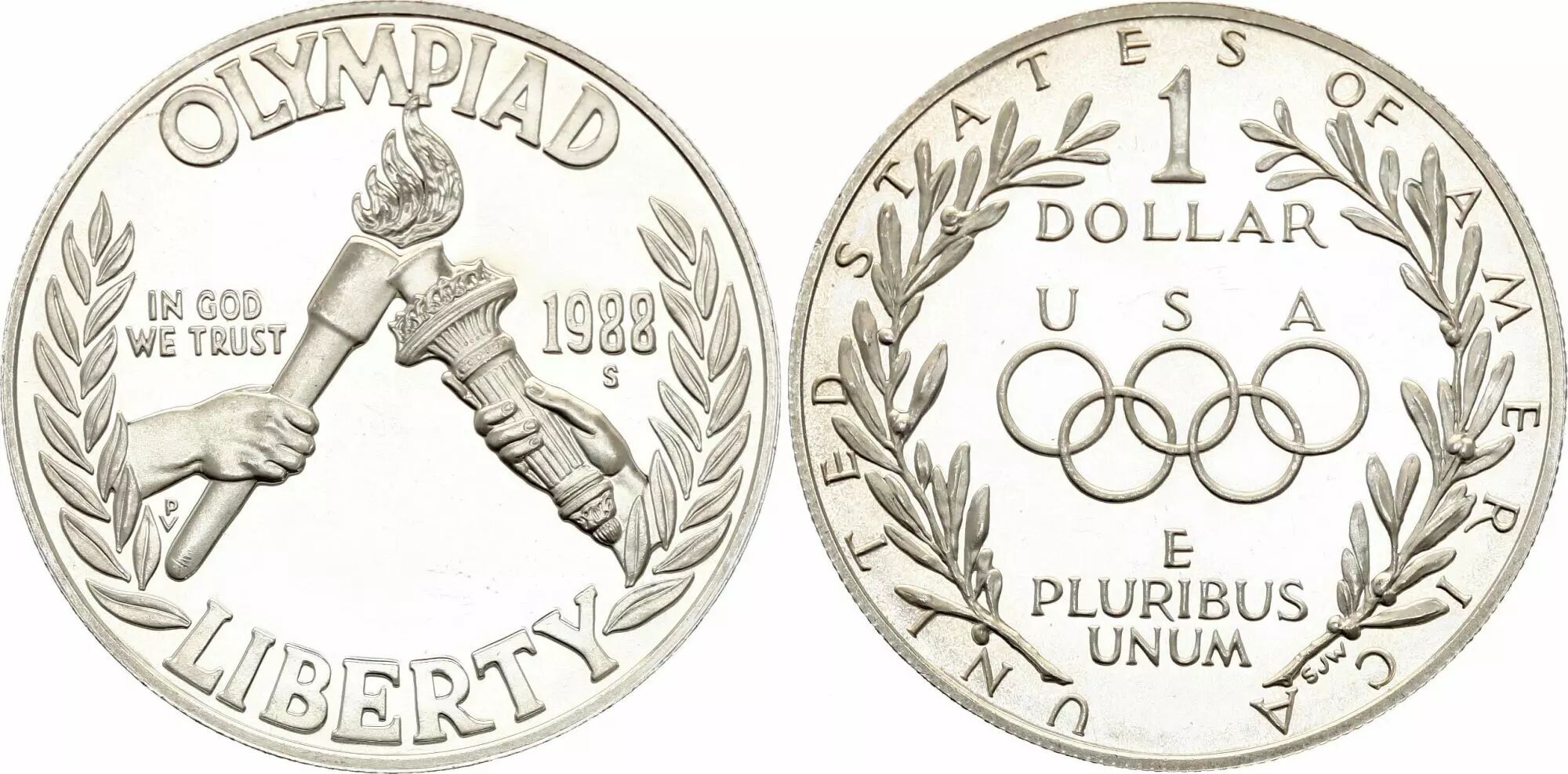 This is a coin with a face value of one dollar, issued by the United States. The coin was minted at the San Francisco Mint, identified by the mint mark "S". The year of issue of this coin is 1988.