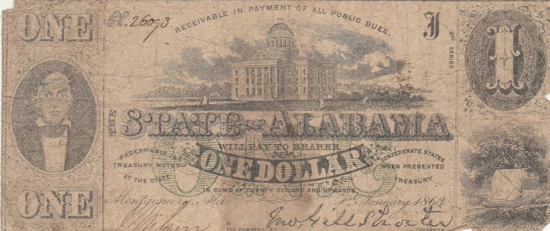 L'avers du billet présente une composition complexe. Au centre, une figure allégorique féminine est assise, symbolisant probablement l'État de l'Alabama. Elle est entourée d'éléments agricoles tels que des ballots de coton, évoquant l'économie de l'État à cette époque. De chaque côté de cette scène centrale, des motifs ornementaux encadrent la valeur faciale "1" en chiffres. Le texte "The State of Alabama" est inscrit en haut du billet, identifiant l'émetteur. Des signatures manuscrites sont apposées en bas du billet, authentifiant son émission.
