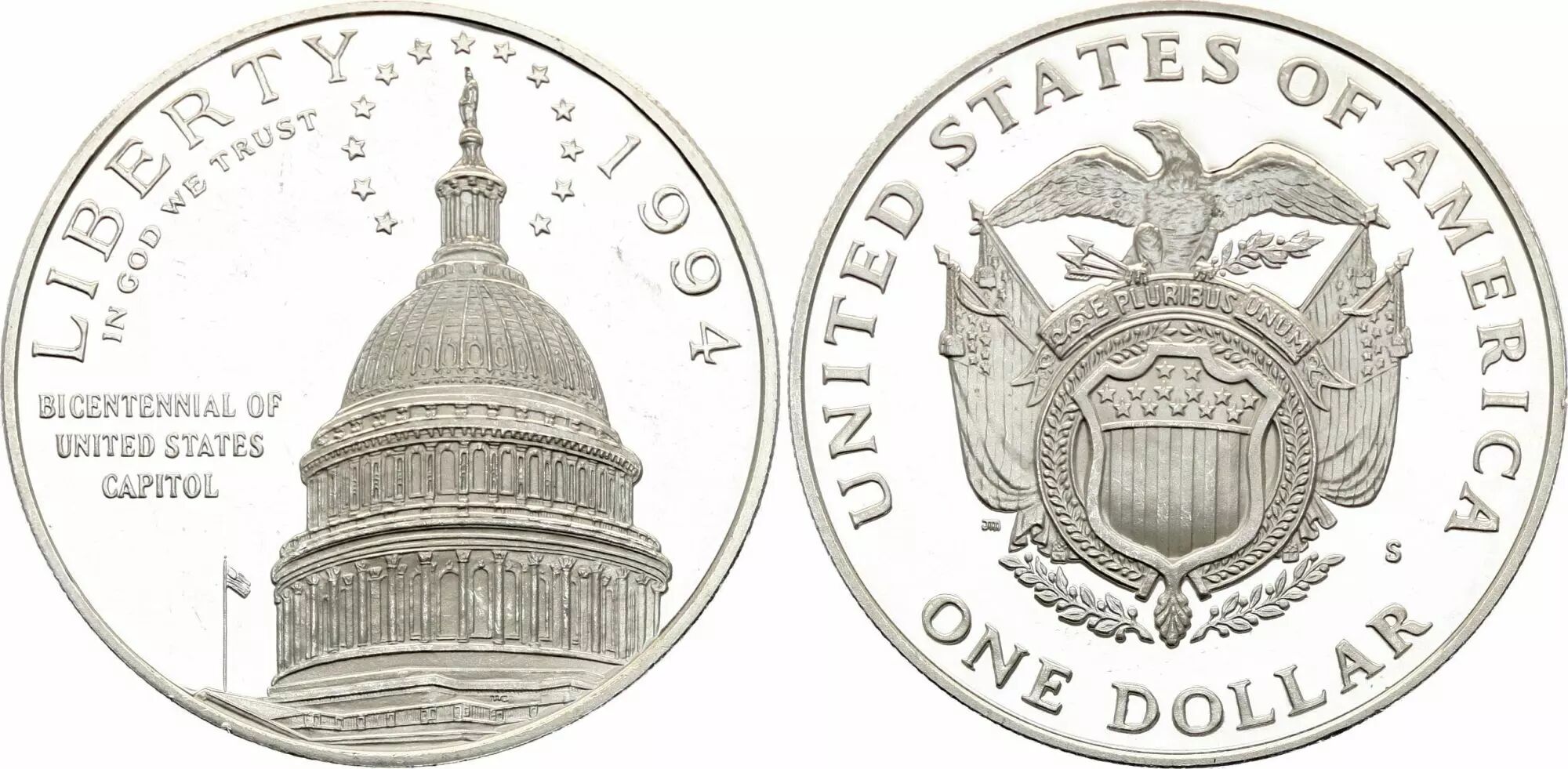 This is a coin with a face value of one dollar, issued by the United States. The coin was minted in 1994 at the San Francisco mint, identified by the mint mark "S". It is made of silver, weighs 26.73 grams and has a diameter of 38.1 millimeters. The coin commemorates the United States Capitol.