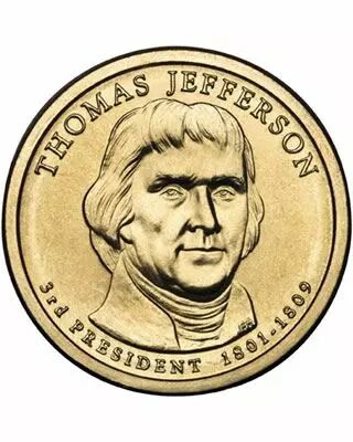 Thème : Thomas Jefferson" - Série : "Les Présidents des Etats-unis sur des pièces de 1 dollar".