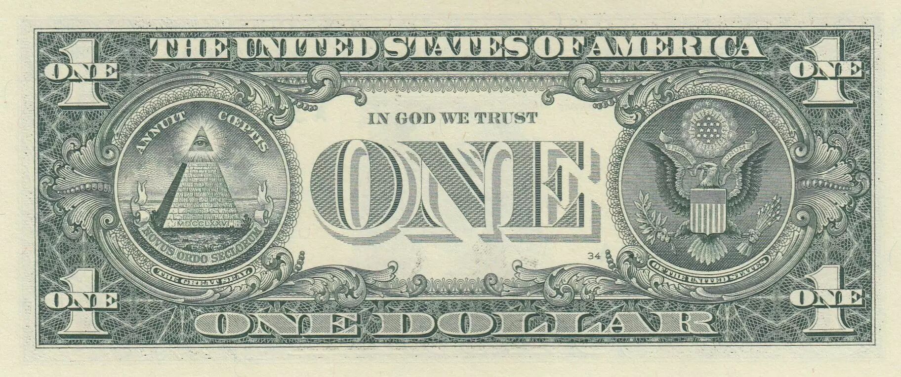 Le verso montre le Grand Sceau des États-Unis, avec l?aigle américain et la pyramide inachevée avec l?Å’il de la Providence, ainsi que les inscriptions standard de la réserve fédérale et la valeur faciale « ONE DOLLAR ». Ce billet conserve le design historique caractéristique des billets d?un dollar américain, avec des dispositifs de sécurité basiques adaptés à sa faible valeur faciale.