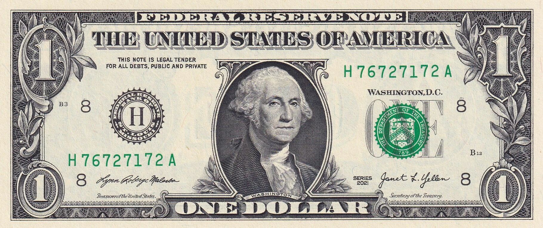 This banknote is issued by the United States of America, with a face value of one dollar. The year of issue of this banknote is 2021 and it belongs to the H-A series. It is important to note that it was manufactured at the Fort Worth printing plant, recognizable by the letter "H" located in the serial number.