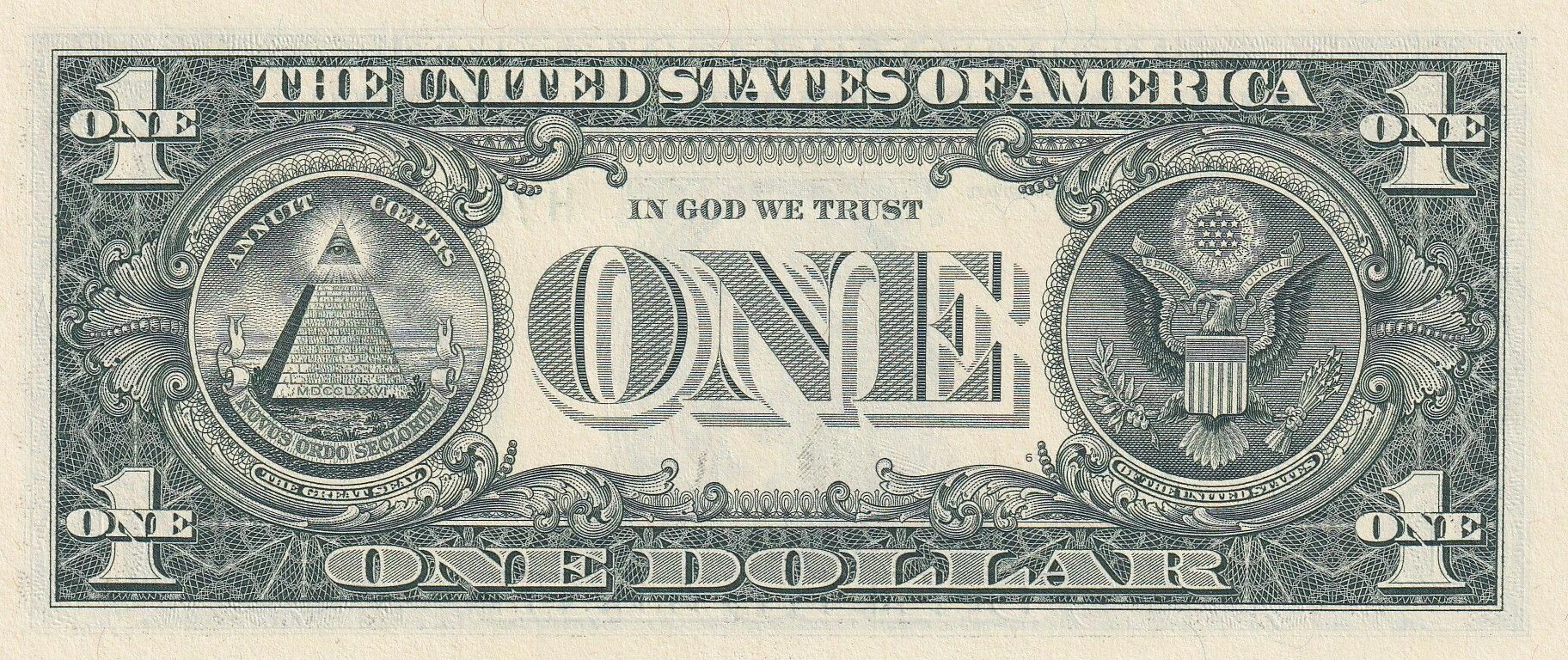 The reverse of the note features the Great Seal of the United States. It notably shows an unfinished pyramid, with the year 1776 inscribed in Roman numerals (MDCCLXXVI) at its base, symbolizing the date of US independence. The banknote has dimensions of 156 mm in length and 67 mm in width.