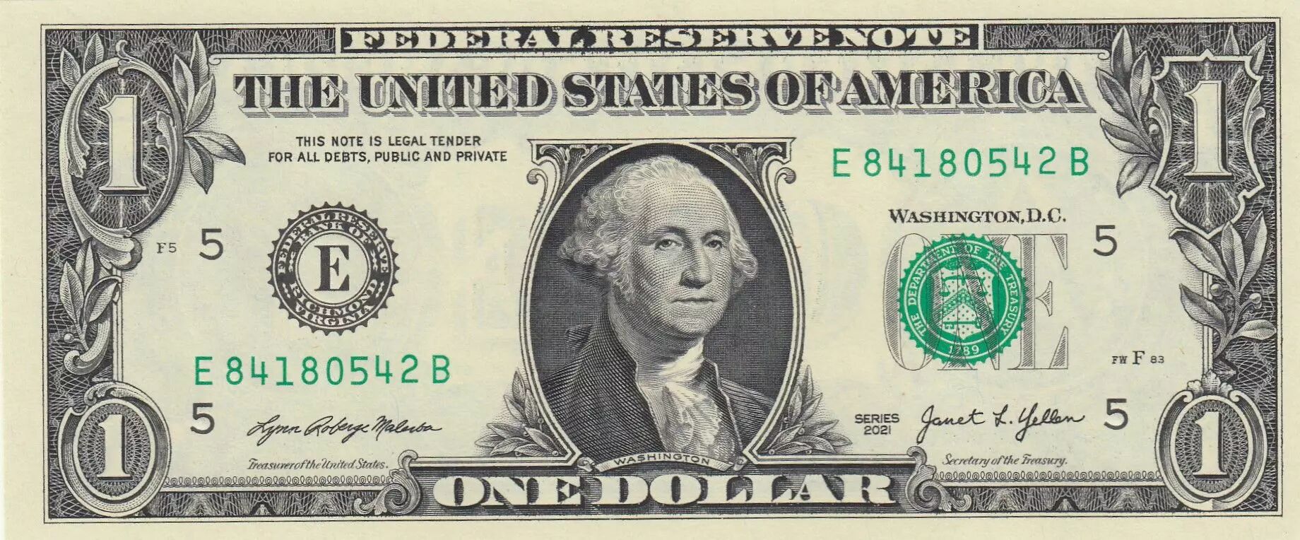 Le recto du billet présente un portrait de George Washington, le premier président des États-Unis. La gravure est basée sur une ?uvre de Gilbert Stuart, un peintre américain renommé pour ses portraits de personnalités de l'époque. Le portrait de Washington est entouré d'ornements et d'inscriptions officielles, y compris la désignation de la valeur nominale "ONE DOLLAR".