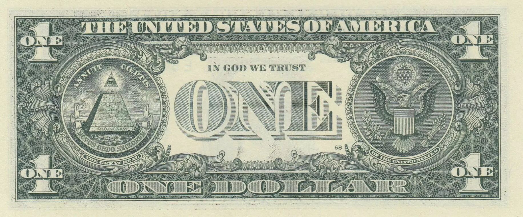 Au verso du billet figure une représentation du Grand Sceau des États-Unis. Le Grand Sceau est composé de deux faces : le recto représente un aigle américain avec un blason sur la poitrine, tenant un rameau d'olivier et des flèches dans ses serres, symbolisant le désir de paix mais aussi la capacité de se défendre. Au-dessus de l'aigle se trouve une constellation de treize étoiles. Le verso du Grand Sceau, moins fréquemment reproduit, montre une pyramide inachevée surmontée d'un ?il, symbolisant la force et la pérennité de la nation.
