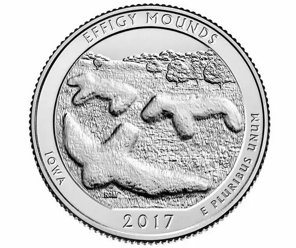 Le America the Beautiful Effigy Mounds National Monument quarter est le premier en 2017 et le numéro 36 dans le America the Beautiful Quarters Program. Le Effigy Mounds National Monument protège l'une de plus grandes concentrations de terrasement des anciens indiens américains dans les États-Unis.
