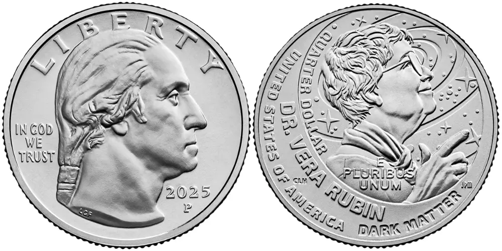 Ce motif au revers représente le profil du Dr Vera Rubin, le regard tourné vers le ciel, souriant, contemplant le cosmos. Elle est entourée d'une galaxie spirale et d'autres corps célestes. Parmi les inscriptions figurent « DR. VERA RUBIN », « QUARTER DOLLAR », « E PLURIBUS UNUM » et « UNITED STATES OF AMERICA ». L'inscription supplémentaire « DARK MATTER », la masse invisible présente dans notre galaxie, figure au bas du motif.