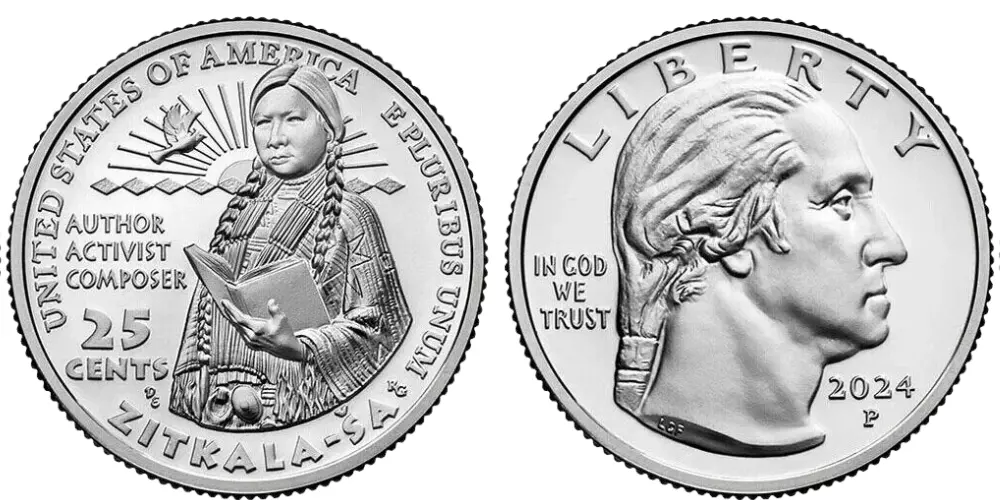 The reverse (tails) side of the coin depicts Zitkala-?a in traditional Yankton Sioux attire, holding a book that represents her work as an author and her successful activism for Native American rights. Behind her, a stylized sun symbolizes her involvement in The Sun Dance Opera, while a cardinal bird represents her name, which means ?Red Bird.? Below the sun is a diamond pattern inspired by Yankton Sioux design. Inscriptions on this side include "UNITED STATES OF AMERICA," "E PLURIBUS UNUM," "AUTHOR," "ACTIVIST," "COMPOSER," "25 CENTS," and "ZITKALA-?A."