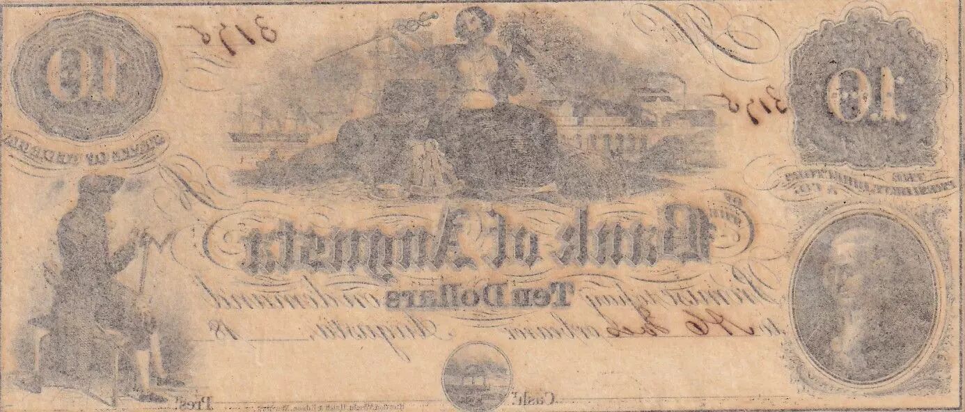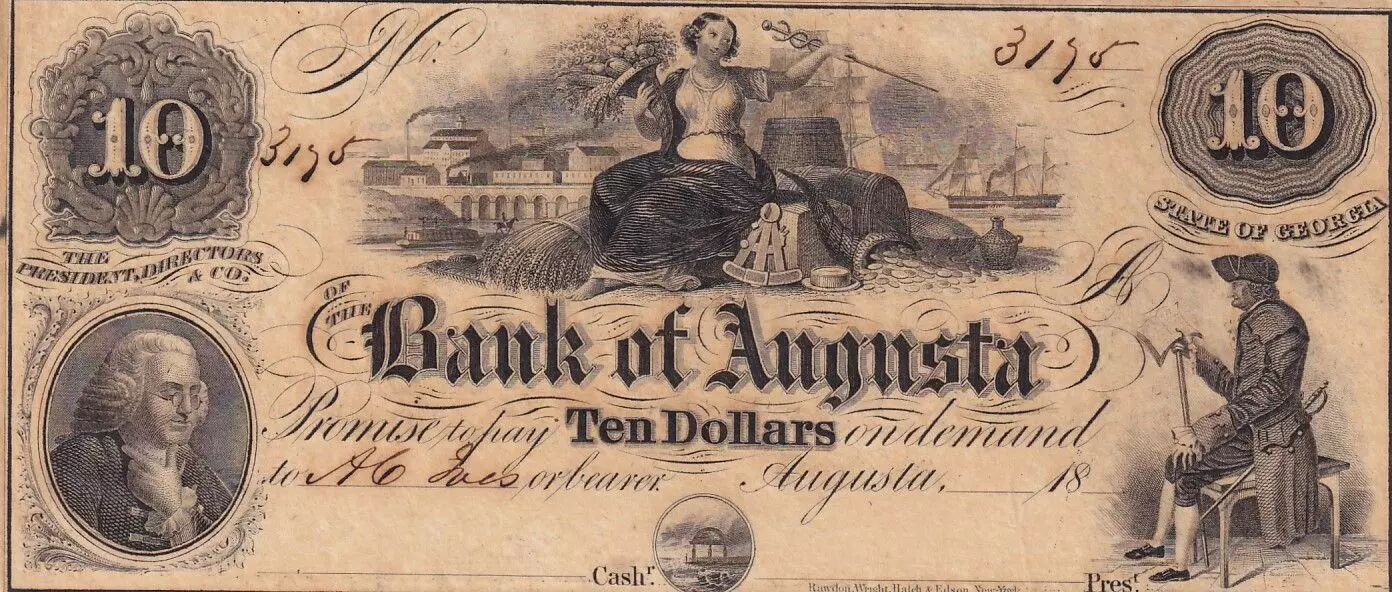 The 10 dollar banknote from the Bank of Augusta, unissued, dating from the period 1850-1865, is an example of the fiduciary production of the time in the United States. This banknote, originating from the State of Georgia, testifies to the private banking system in force before the standardization of the national currency.