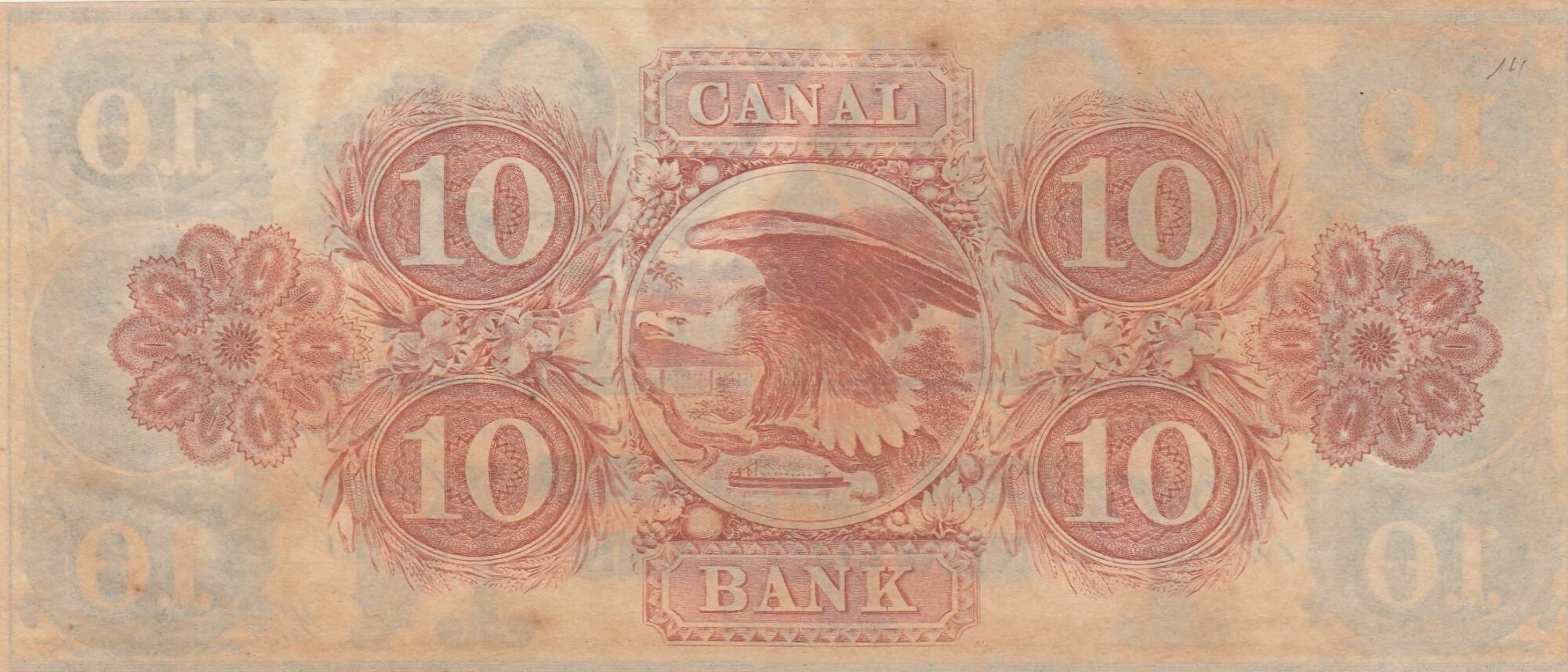 This banknote testifies to the private banking system in effect in the United States in the 19th century, where many local banks were authorized to issue their own currency. The Canal Bank, through this 10-dollar banknote, participated in the local economy by providing a means of exchange recognized in its area of activity.