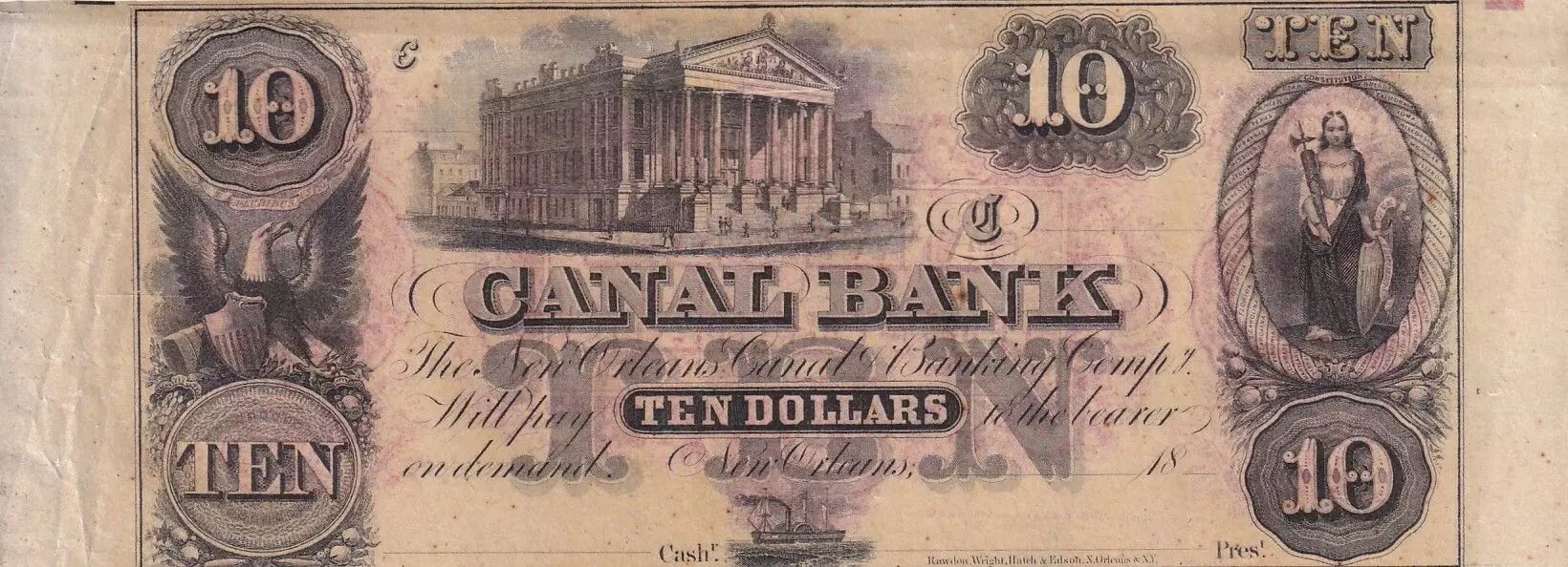 The front of the note features the inscription "CANAL BANK" in capital letters, highlighting the issuing institution. It also reads "The New Orleans Canal & Banking Comp.? will pay TEN DOLLARS to the bearer on demand". The mention of the place and date of issue, "New Orleans, _______________ 18____", is also present, indicating that the date was completed manually upon issuance.