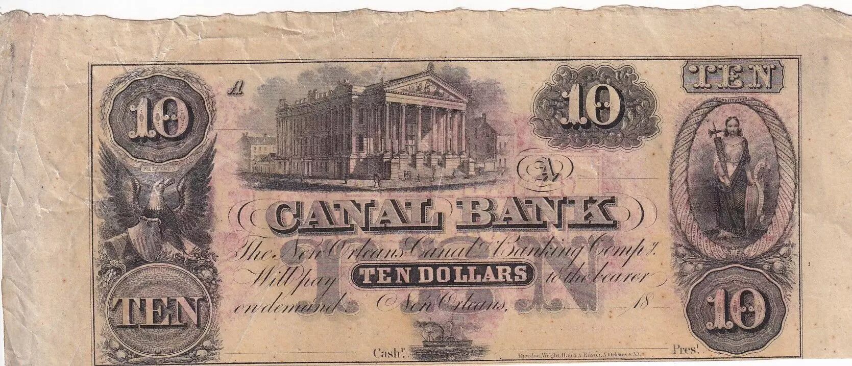 L'avers du billet présente l'inscription "CANAL BANK" en lettres capitales, soulignant l'institution émettrice. On y lit également "The New Orleans Canal & Banking Comp.? will pay TEN DOLLARS to the bearer on demand". La mention du lieu et de la date d'émission, "New Orleans, _______________ 18____", est également présente, indiquant que la date était complétée manuellement lors de l'émission.