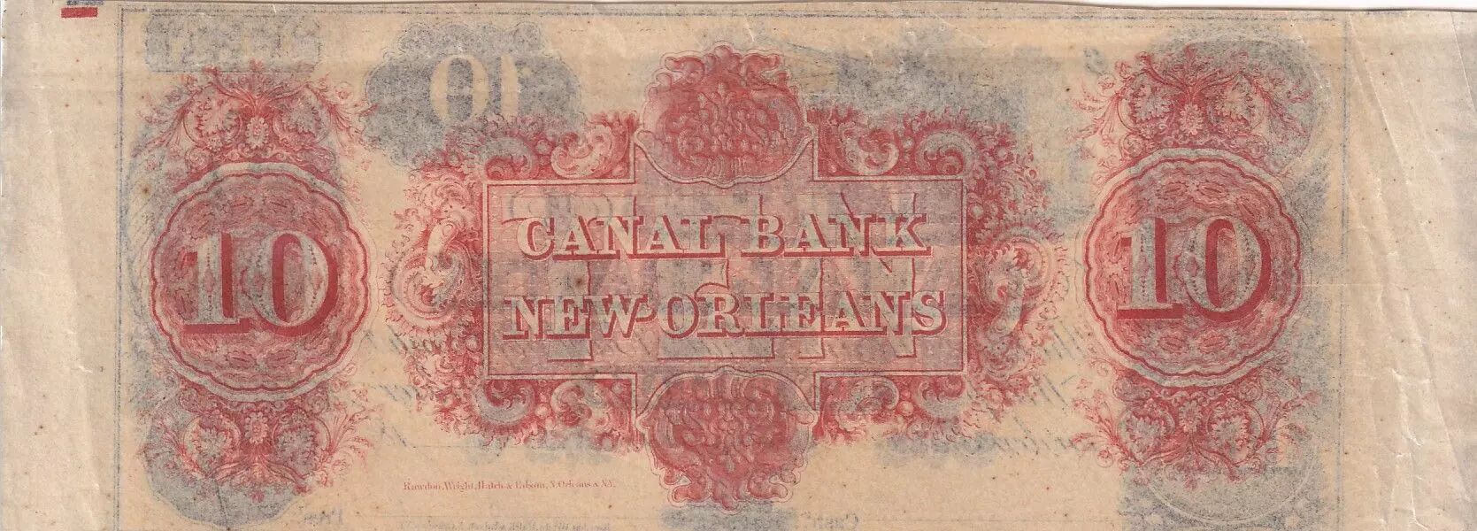 L'avers du billet présente l'inscription "CANAL BANK" en lettres capitales, soulignant l'institution émettrice. On y lit également "The New Orleans Canal & Banking Comp.? will pay TEN DOLLARS to the bearer on demand". La mention du lieu et de la date d'émission, "New Orleans, _______________ 18____", est également présente, indiquant que la date était complétée manuellement lors de l'émission.