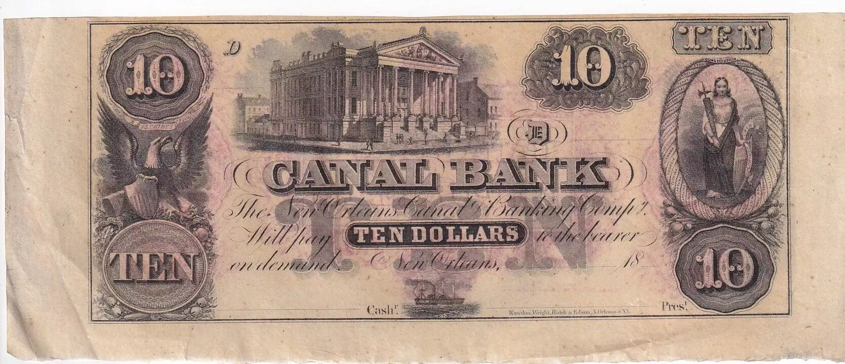 L'avers du billet présente l'inscription "CANAL BANK" en lettres capitales, soulignant l'institution émettrice. On y lit également "The New Orleans Canal & Banking Comp.? will pay TEN DOLLARS to the bearer on demand". La mention du lieu et de la date d'émission, "New Orleans, _______________ 18____", est également présente, indiquant que la date était complétée manuellement lors de l'émission.