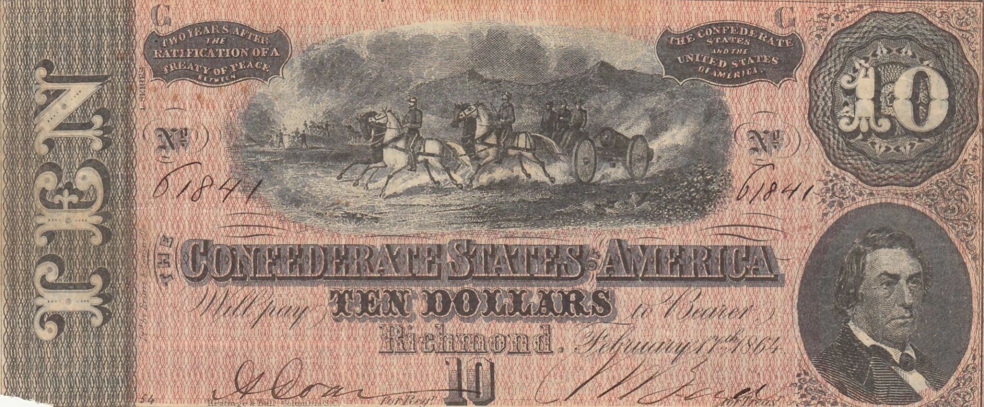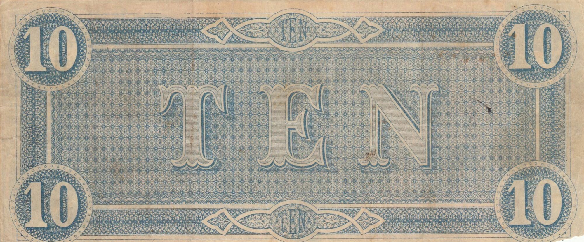 This Confederate States of America banknote was issued in 1864. Its face value is 10 dollars.