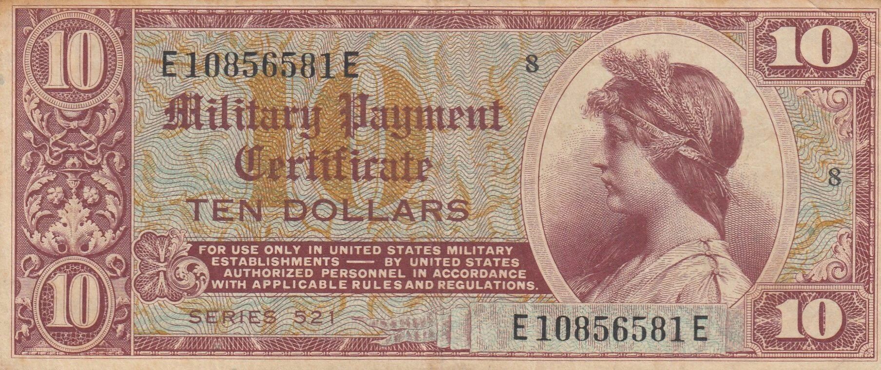 This 1954 10 US dollar banknote belongs to the 521 series of Military Payment Certificates (MPC). These banknotes were used by American military personnel in certain areas abroad to prevent the black market in US dollars.