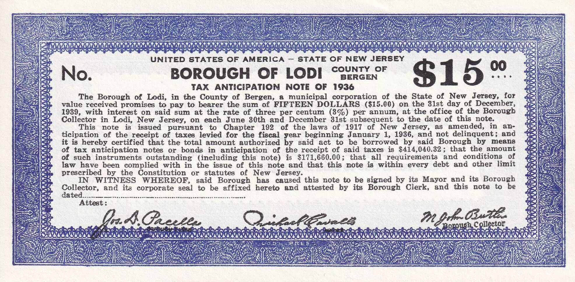 Home > > USA 15 Dollars - Borough of Lody - New Jersey