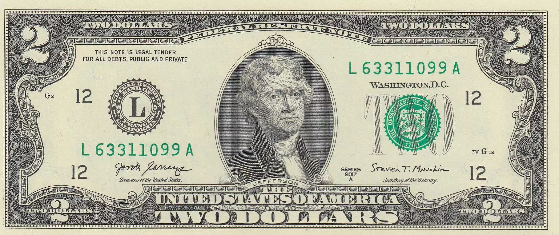 The front of the $2 bill features a portrait of Thomas Jefferson, the third President of the United States (1801-1809). Jefferson is a prominent figure in American history, particularly for his role as the primary author of the Declaration of Independence. The portrait of Jefferson is an engraving based on a portrait painted by Gilbert Stuart.