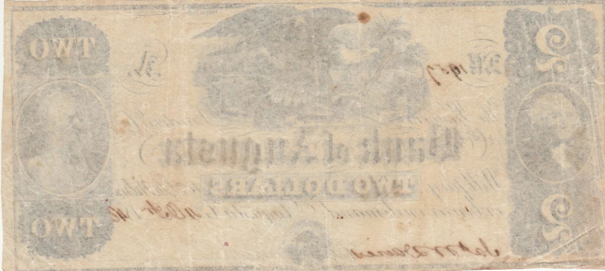 Ce billet de banque provient des États-Unis et affiche une valeur nominale de deux dollars. Il s'agit d'un billet non émis de la Bank of Augusta, datant de la période 1850-1865.