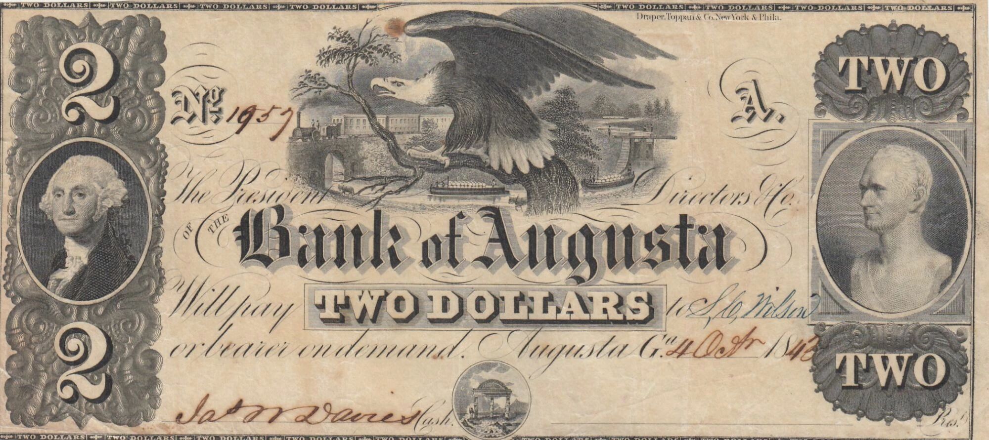 This banknote originates from the United States and has a face value of two dollars. It is an unissued note from the Bank of Augusta, dating from the period 1850-1865.