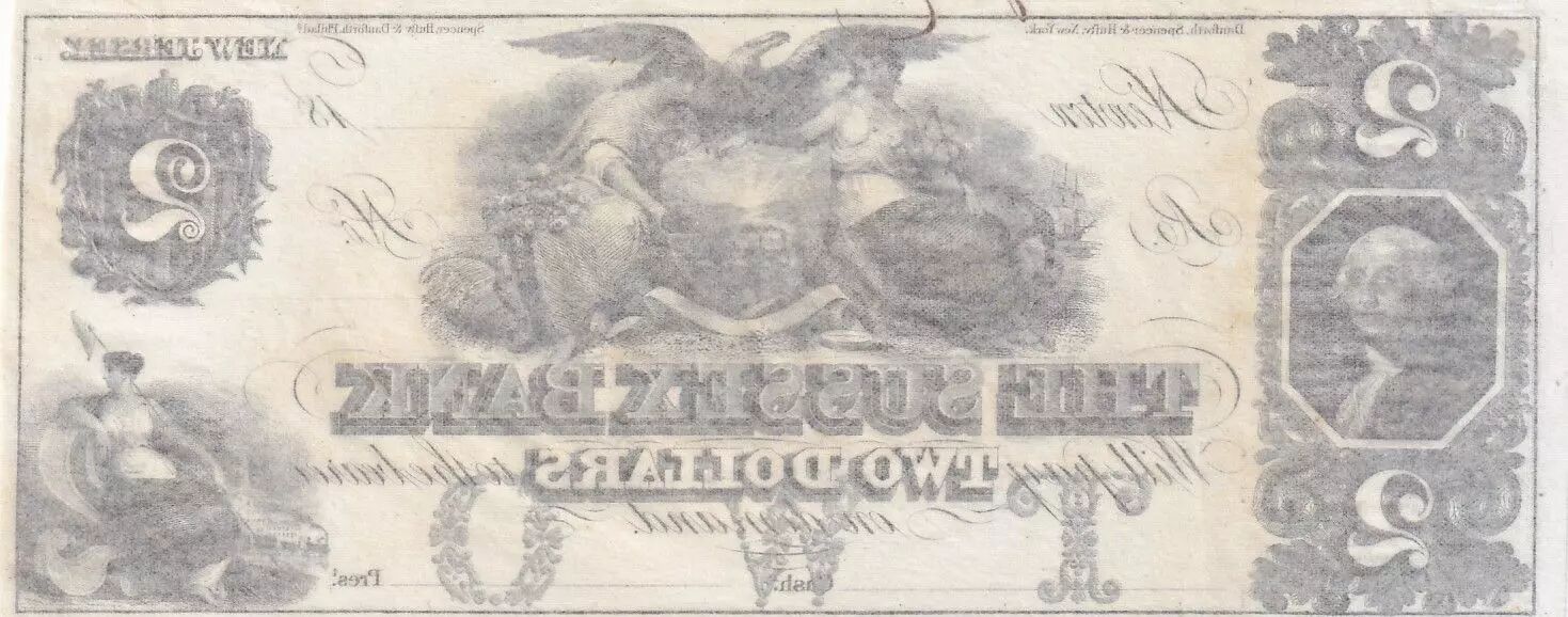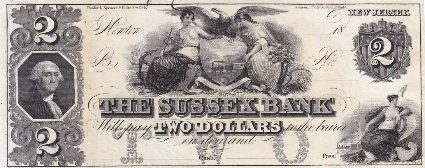 This 2-dollar banknote was issued by the Sussex Bank, located in Newton, New Jersey, during the 19th century. The period of issuance is between 1818 and 1865, when the bank was renamed Sussex National Bank of Newton.