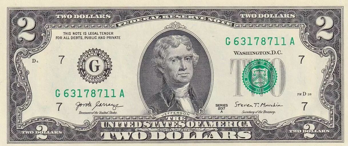Banknote USA 2 Dollars - Chicago - Jefferson - 2017A - Serial G7 Chicago