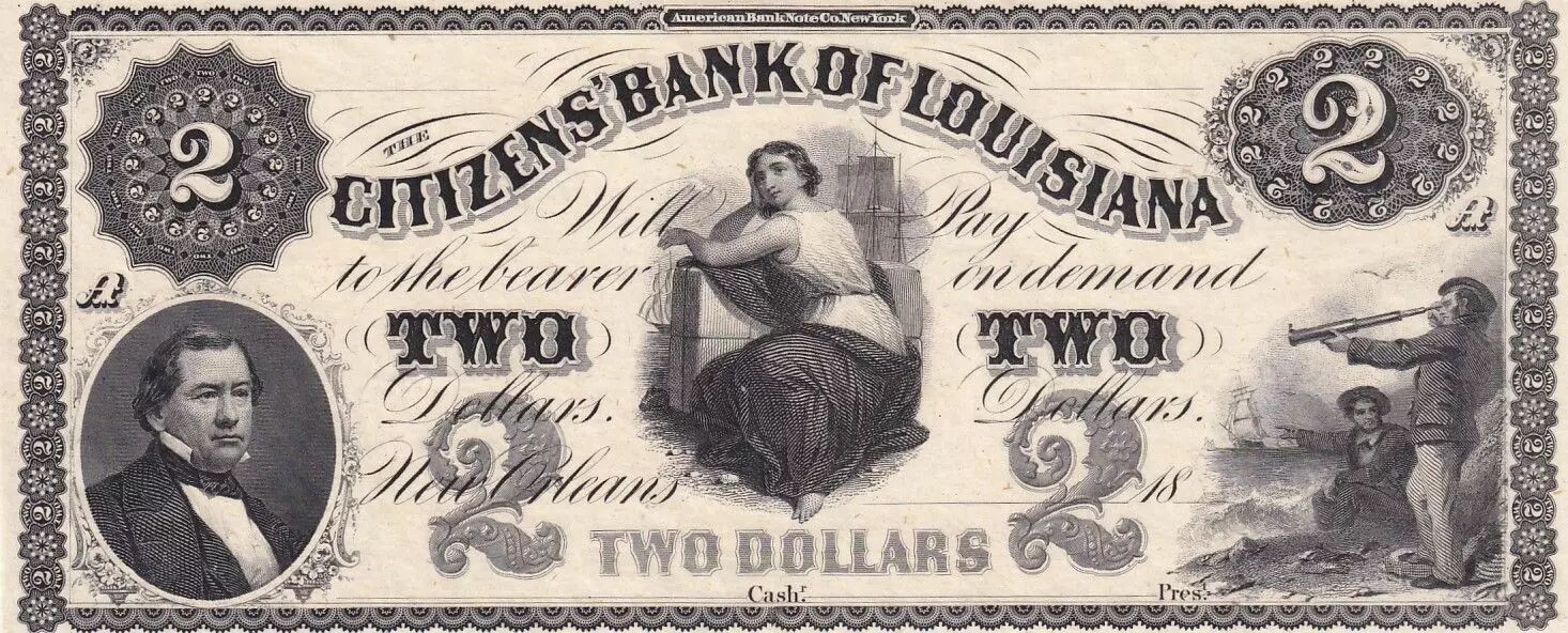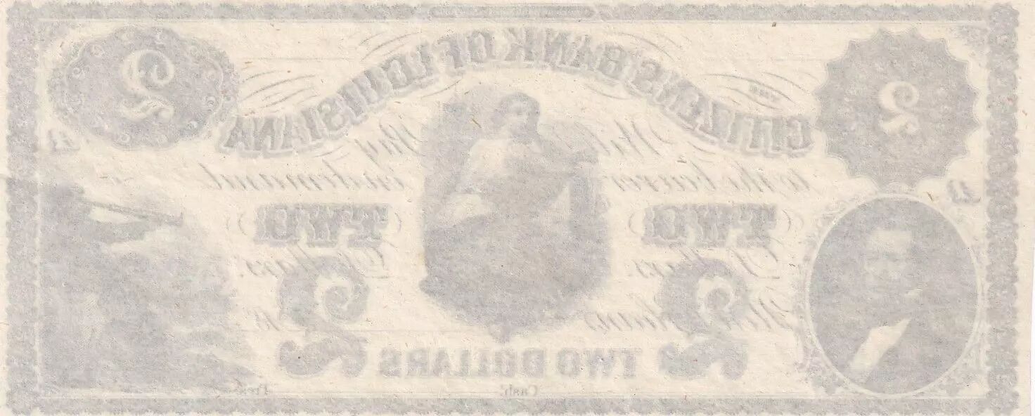 This banknote is an unissued 2-dollar bill from the Citizen's Bank of Louisiana. It dates back to the 1860s. This type of banknote was used as a private means of payment in Louisiana, in the absence of federal banknotes issued by the US Treasury at that time.