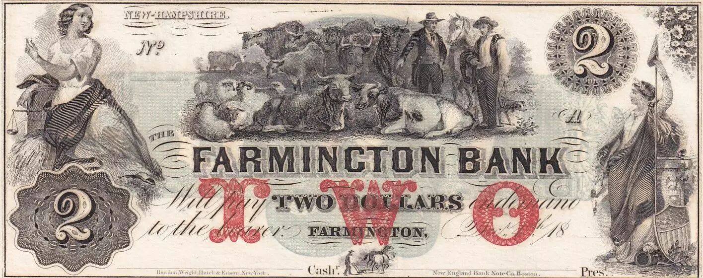 The 2-dollar note issued by Farmington Bank, located in New Hampshire, dating from a period between 1851 and 1899, is an example of an unissued banknote from that era. This note, with a face value of two dollars, features an elaborate design and distinctive characteristics.
