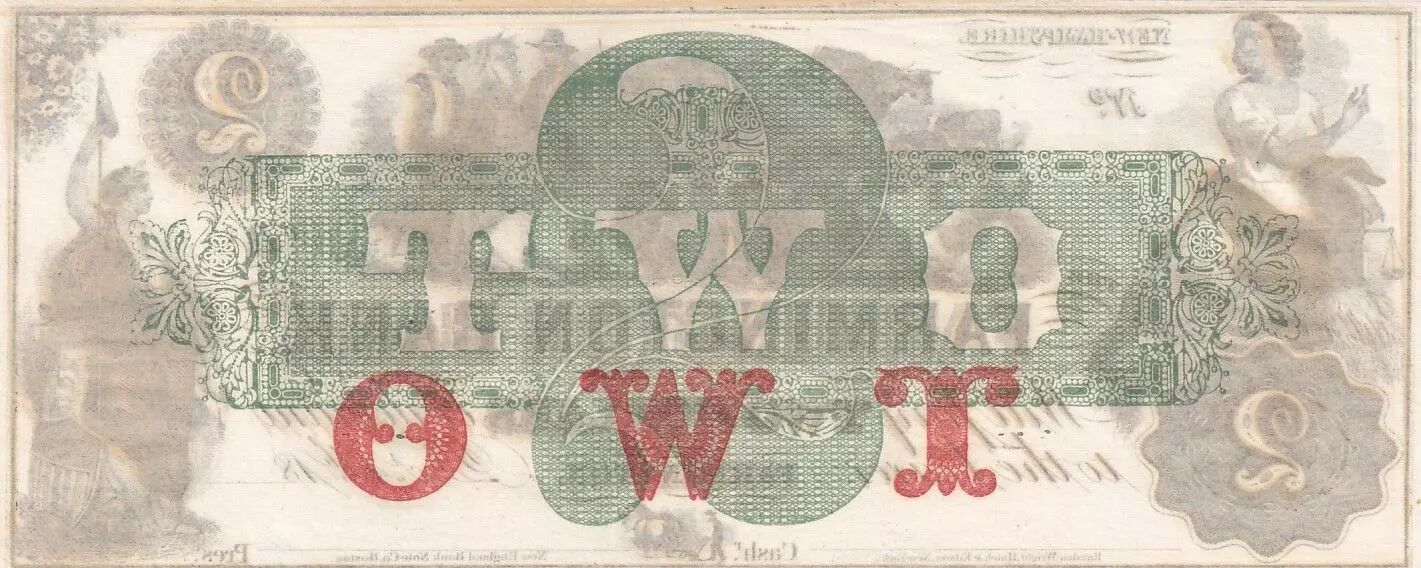 The reverse of the note highlights the face value "TWO" in red, printed in reverse. The name of the printer, "Rawdon, Wright, Hatch & Edson, New York", is also mentioned.