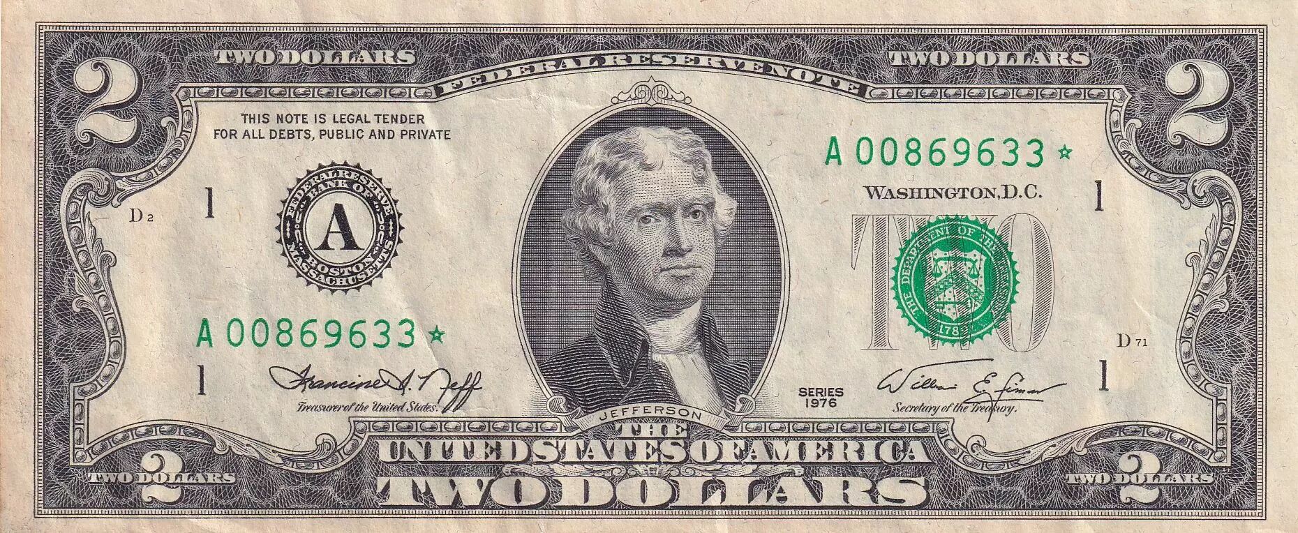 Banknote USA 2 Dollars - Jefferson - 1976 - Remplacement serial (star) - A (Boston) - A00869633*