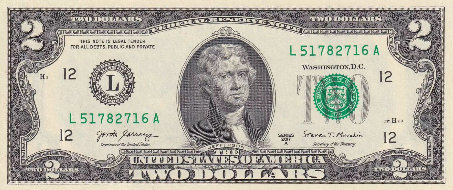 Accueil > Archivage > archivage-Billets du Monde > USA 2 Dollars Jefferson - 2017 - L12 San Francisco