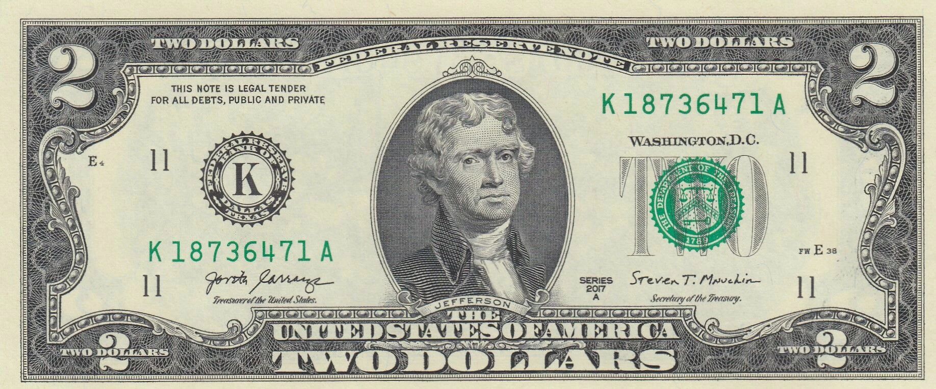 The 2 dollar bill is a relatively rare denomination in circulation in the United States. Although legally usable, it is less frequently encountered than 1, 5, 10 or 20 dollar bills. As a result, it is sometimes perceived as a collector's item or curiosity. The series and the letter "K" indicate specific information about the production lot and the associated Federal Reserve district.