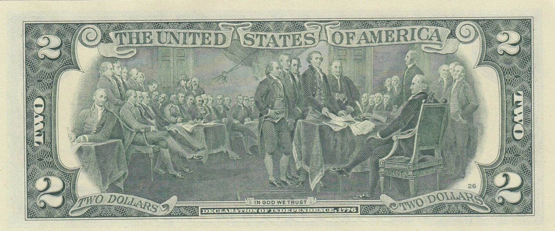 Le revers du billet représente une reproduction de la peinture "La Déclaration d'indépendance", réalisée par John Trumbull. Cette peinture représente la présentation du projet de Déclaration d'indépendance au Congrès. Divers personnages historiques sont représentés, dont John Adams, Benjamin Franklin et Thomas Jefferson lui-même. La valeur nominale "2" est également visible en grand format au centre du revers.