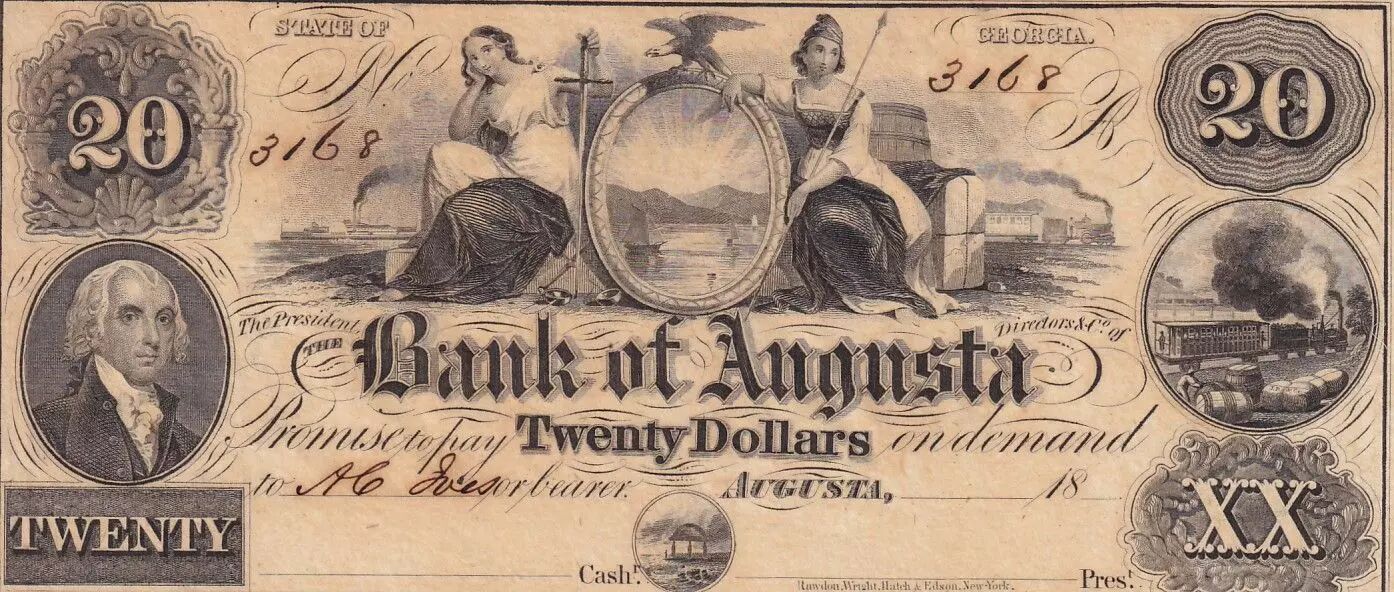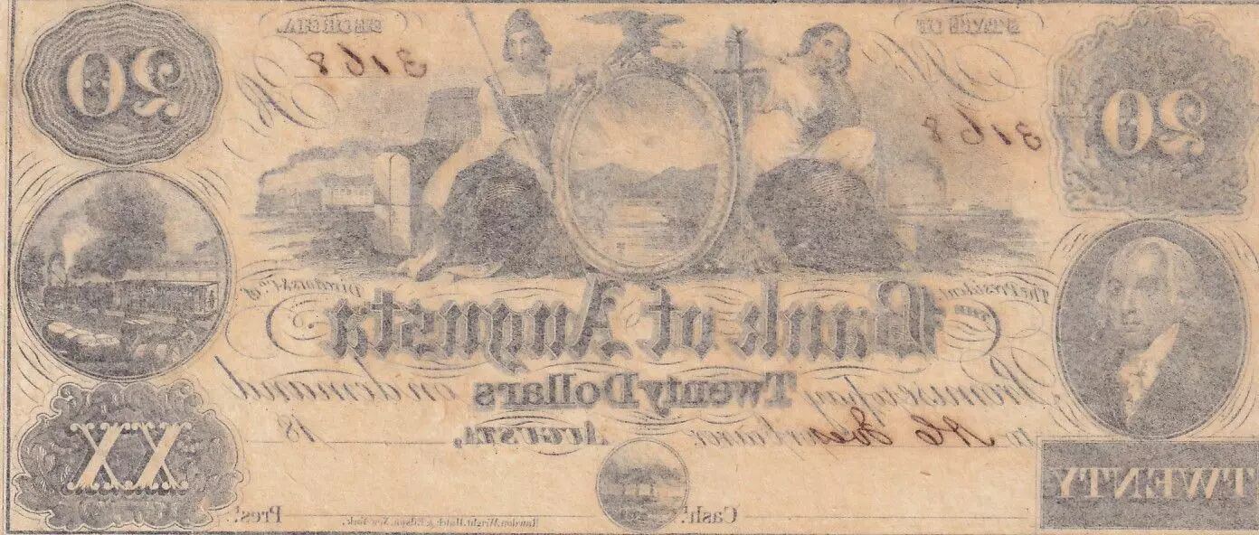 This unissued 20-dollar banknote comes from the Bank of Augusta, located in the State of Georgia, USA. Its issuance period is between 1850 and 1865. The banknote is of the obverse only type (UNIFACE).