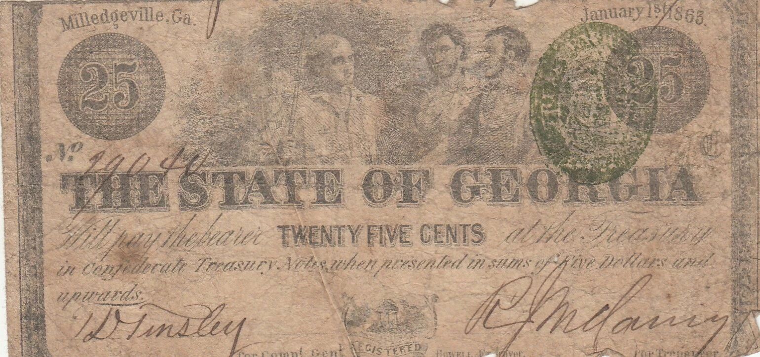 Ce billet de 25 cents a été émis par l'État de l'Alabama en 1863 aux États-Unis. Il s'agit d'un type de monnaie fiduciaire émis en réponse aux pénuries de pièces de monnaie pendant la guerre de Sécession.