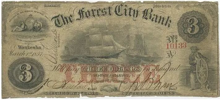 La Forest City Bank ouvrit ses portes en 1857 et fut une rareté parmi les banques libres du Wisconsin.Elle survécut à la panique de 1857 et au déclenchement de la guerre civile pour devenir la Farmers National Bank (Charte 1159) en 1865. Billet Rare !