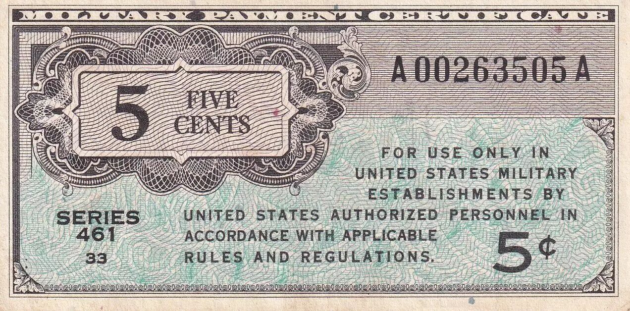 Accueil > Archivage > USA 5 Cents - Military Certificate - ND (1946) - Série 461 - P.M1