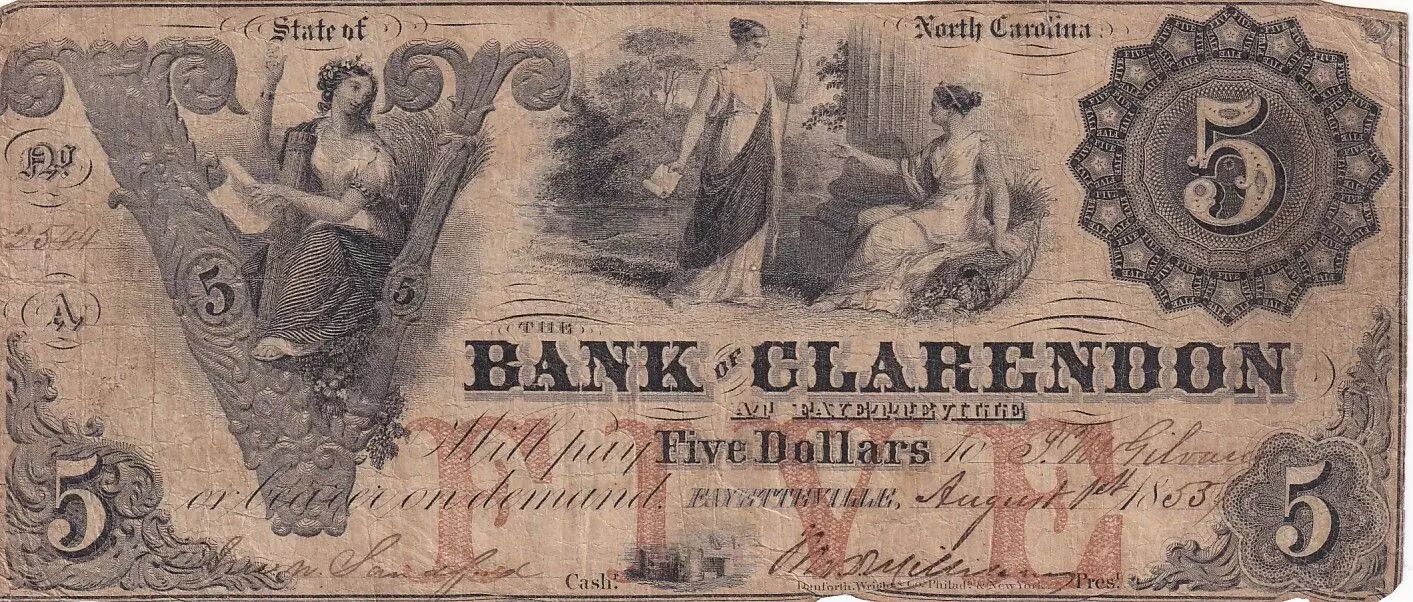 Home > > USA 5 Dollars - Bank of Clarendon - Fayetteville - 1853