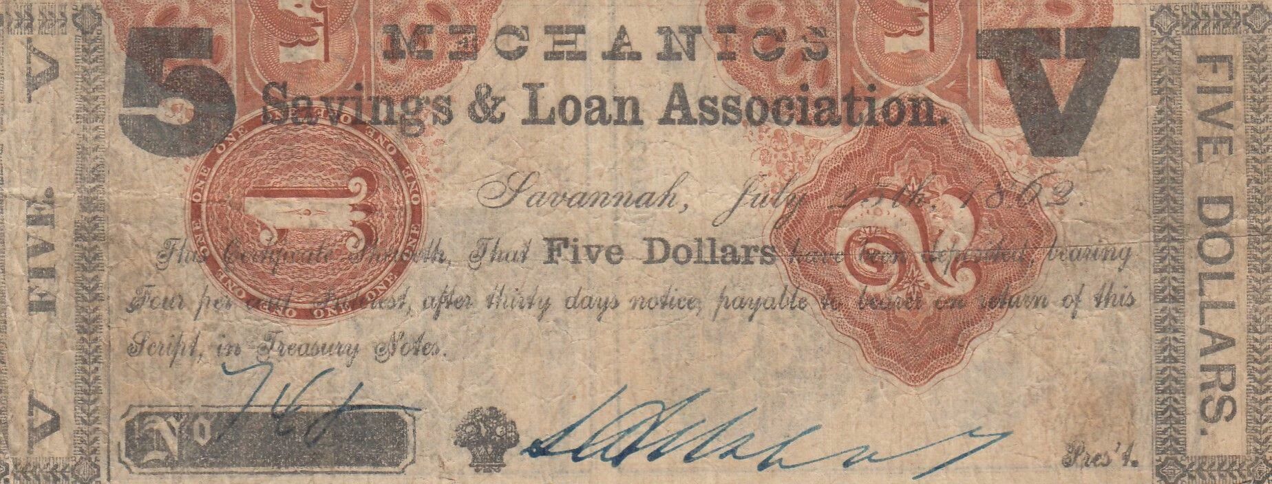 Ce billet de banque provient des États-Unis et a été émis en 1862. Il s'agit d'un billet de la Mechanics Savings & Loan Association.
