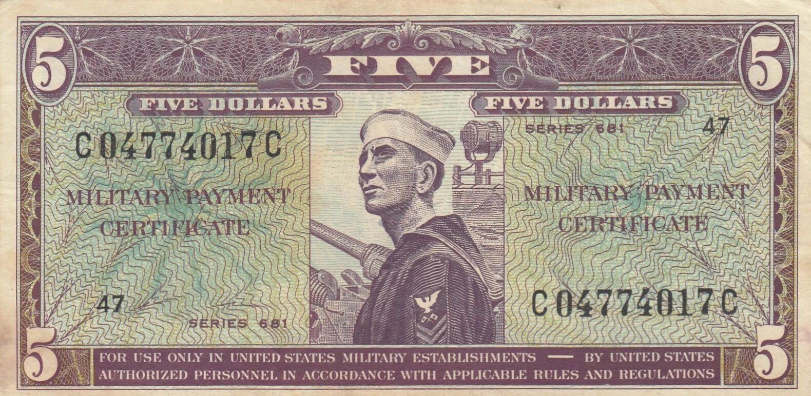 L'état de conservation et la rareté de ce billet de 5 dollars Military Certificate de 1948, Série 681-47, influencent sa valeur numismatique. Les collectionneurs et les passionnés de numismatique s'intéressent à ces billets en raison de leur importance historique, de leur rôle dans les opérations militaires et de leur contribution à l'histoire monétaire des États-Unis.