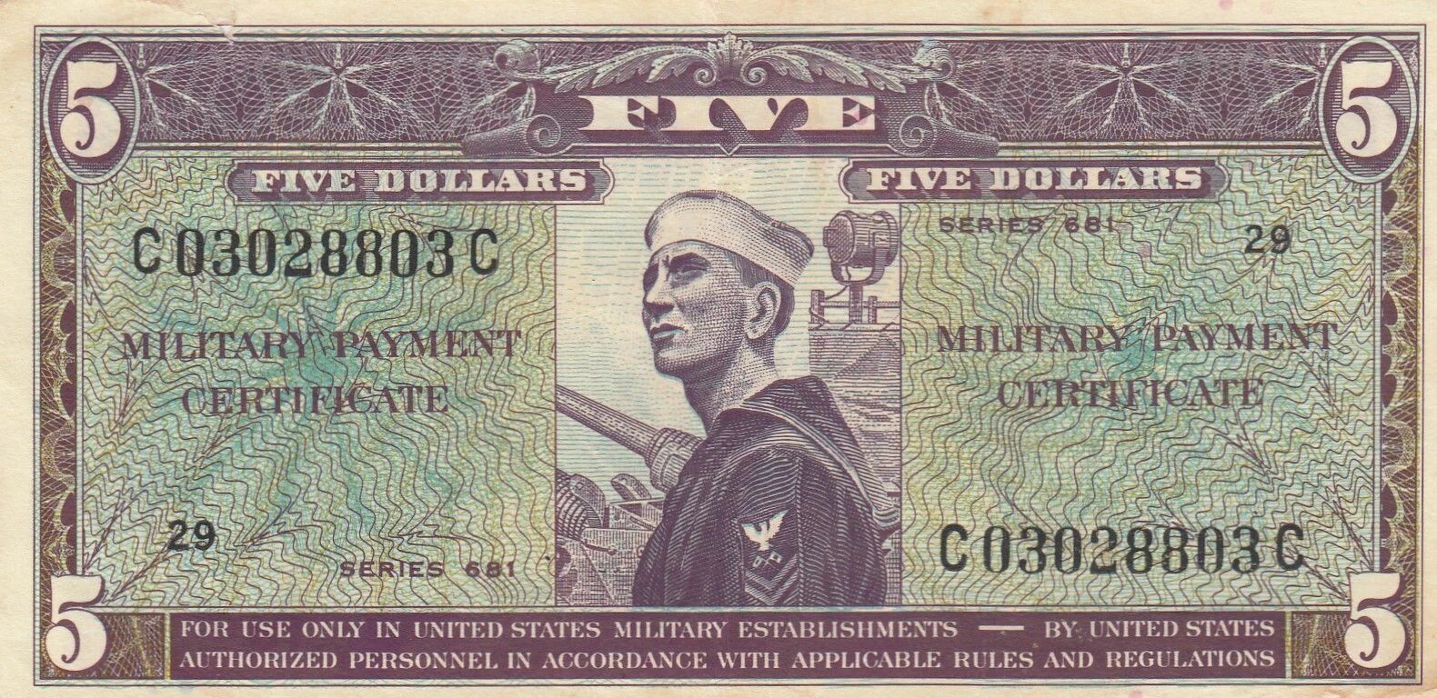 This banknote is a military payment certificate with a value of five U.S. dollars, issued in 1948. It belongs to Series 681-29.