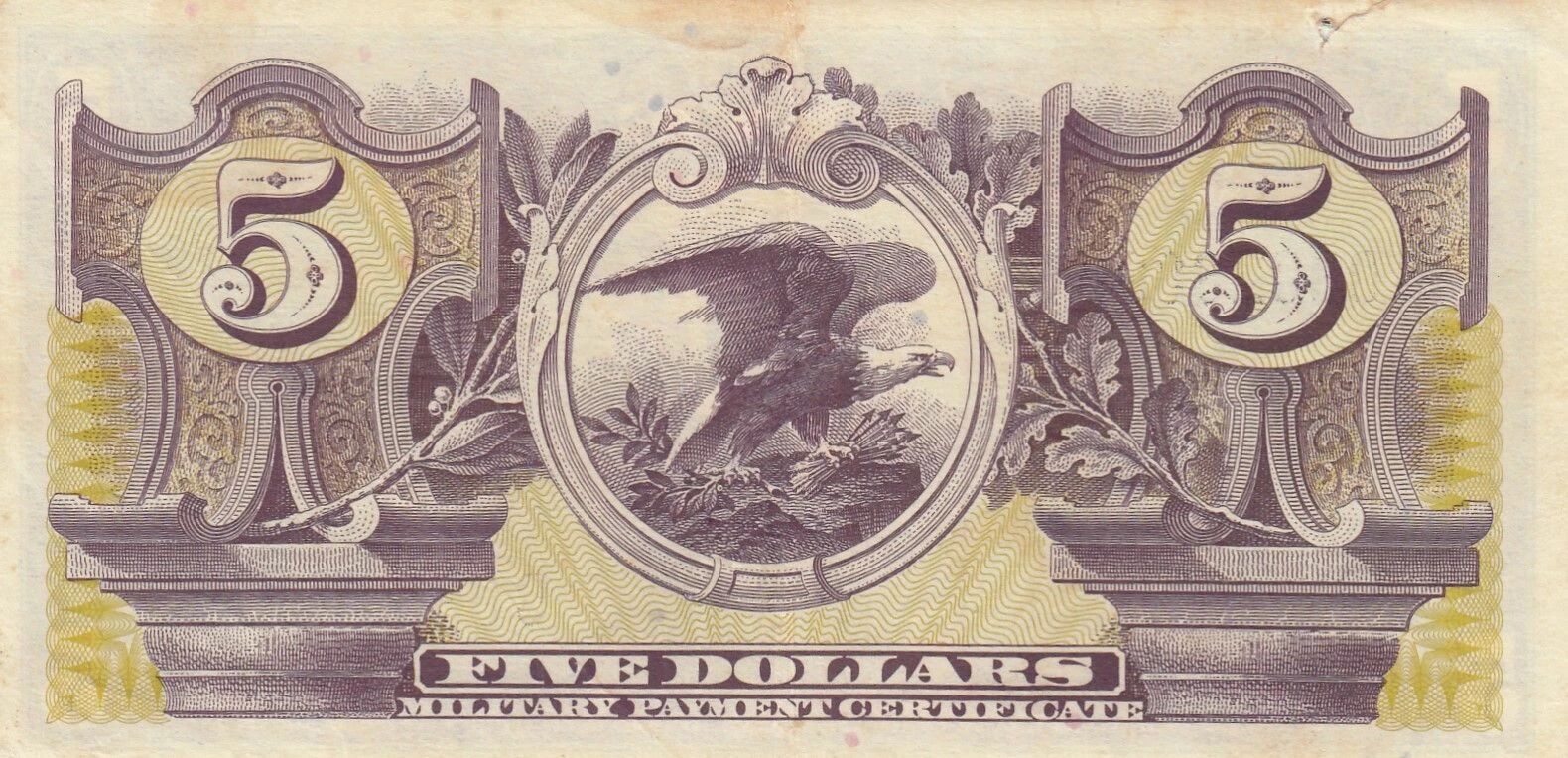 The five-dollar bill in this series has graphic characteristics specific to this type of issue. The colors, patterns, and inscriptions differ from standard U.S. dollar banknotes. The design includes security features to prevent counterfeiting, such as watermarks or special inks. The typography and symbols used are typical of military certificates of that era.