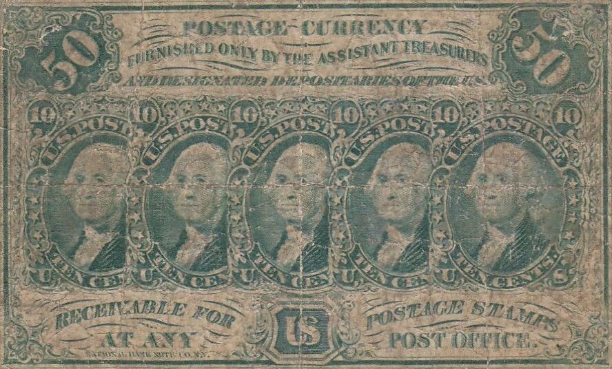The 50 Cent note, issued in 1862, is part of the "Postage Currency" series of the United States. This fiat money was created due to the shortage of metal coins during the Civil War.