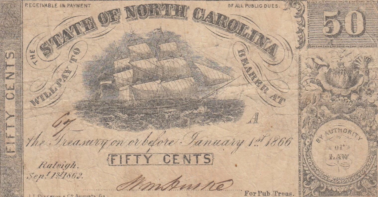 Ce billet de 50 cents a été émis par l'État de Caroline du Nord en 1866. Il s'agit d'un type de papier-monnaie émis pendant une période où les pièces de monnaie étaient rares, notamment en raison des bouleversements économiques et politiques de la Guerre de Sécession.