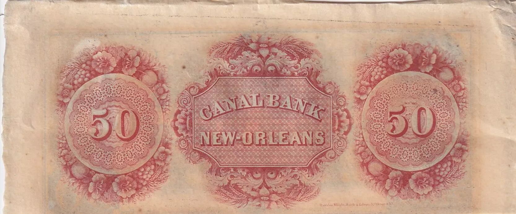 Ce billet de banque de 50 dollars émis par la Canal Bank de La Nouvelle-Orléans, série A, date d'une période comprise entre 1841 et 1895. Il s'agit d'un exemple de billet de banque obsolète, une forme de monnaie privée émise par des banques sans garantie gouvernementale, pratique courante à cette époque aux États-Unis.