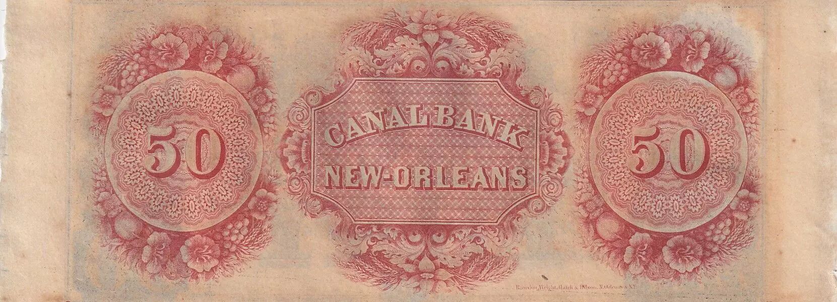 Le verso du billet affiche le nom abrégé de la banque, "CANAL BANK", ainsi que la ville d'émission, "NEW-ORLEANS", et la valeur numérique, "50". Le nom de l'imprimeur, "Rawdon, Wright, Hatch & Edson, New York", est également mentionné. Il est à noter que certains billets ont été découpés plus largement et peuvent présenter des rebords pliés au verso, comme observé sur cet exemplaire.