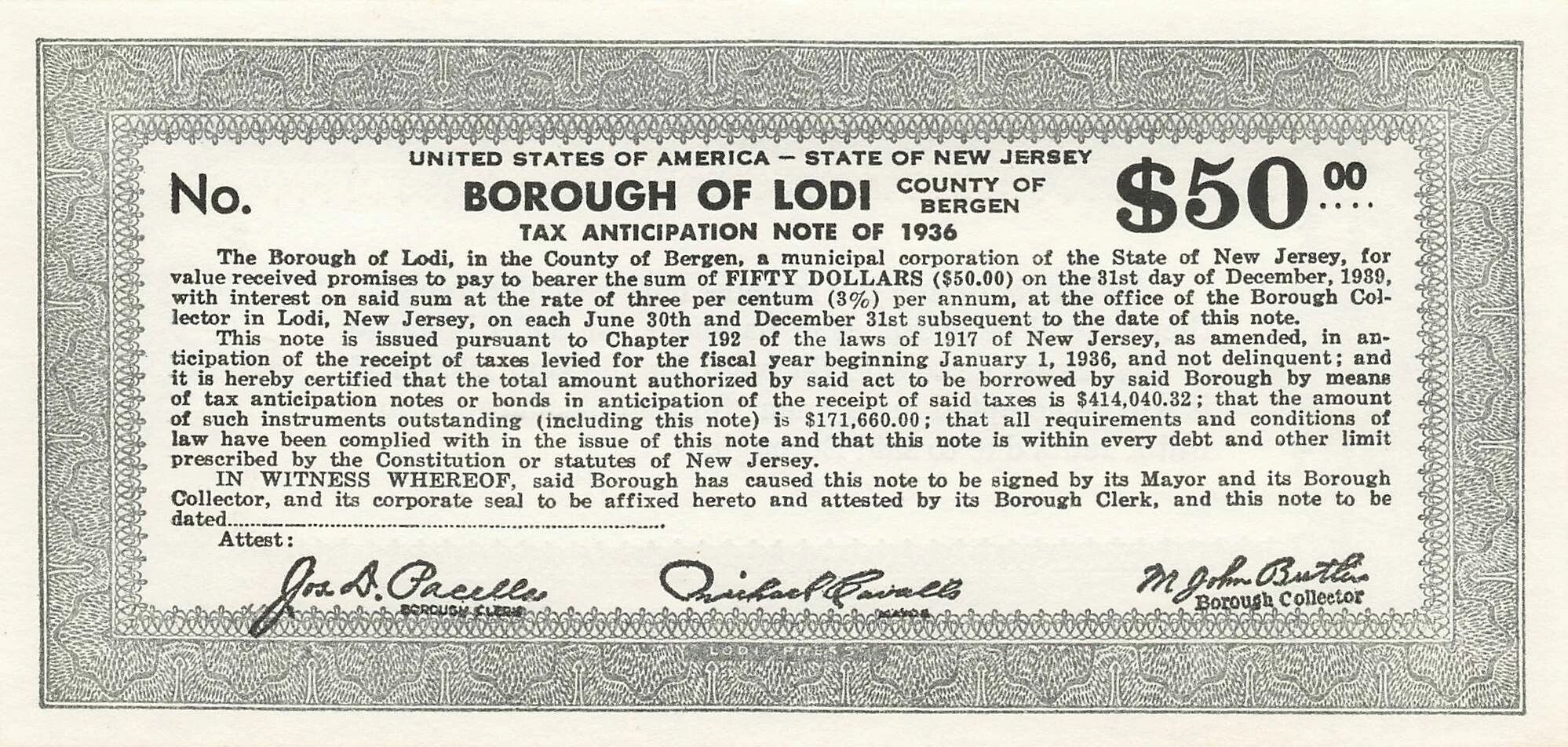 Home > World Banknotes > American Banknotes > United States of America > USA 50 Dollars - New Jersey - Lodi - Tax Anticipation Note