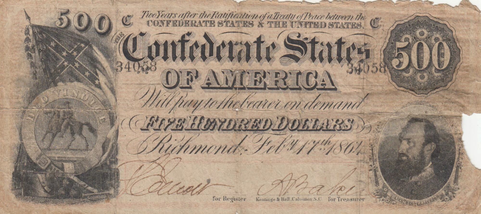 This banknote originates from the Confederate States of America. It was issued in 1864 and has a face value of 500 dollars.